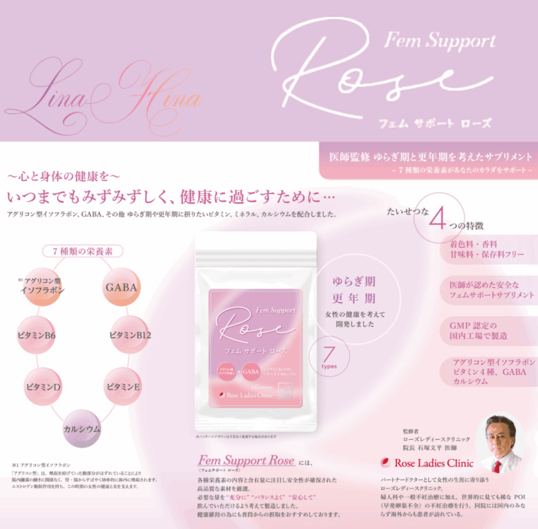 Fem Support Roseはローズレディースクリニック医師監修のもと、エビデンスに基づき、アグリコン型イソフラボン、GABA、カルシウム、ビタミン類を含む天然由来のサプリメントです。